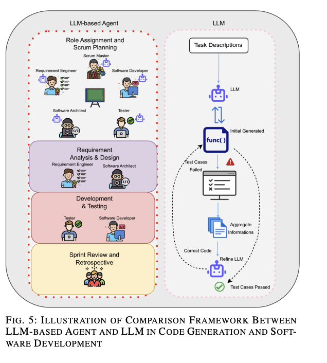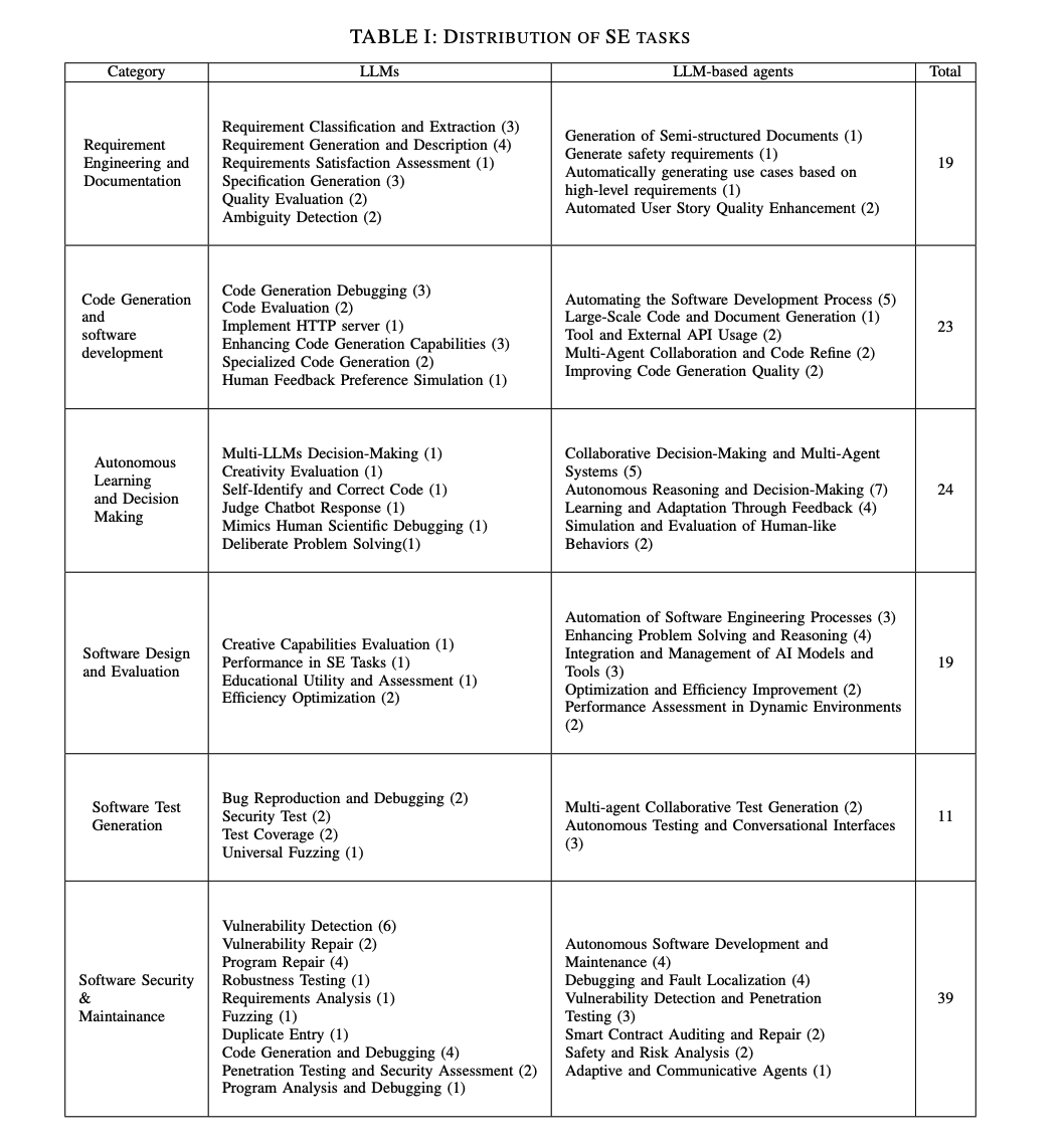 この論文では、ソフトウェア工学における 要件工学、コード生成、自律的意思決定、ソフトウェア設計、テスト生成、ソフトウェア保守 の6つの観点において、様々な先行文献をもとに、LLMとLLMベースのエージェントによる作業、タスク、評価指標における類似点を比較した上で、効果の分析をしています。