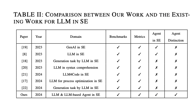 他の研究では、LLMのいくつかのSEタスクへの応用が調査されています[17][8][18]が、最近の研究開発を含む一般的なSE分野の広範なカバーは欠けています。さらに、これらの研究の主な貢献はLLMに焦点を当てていますが、LLMとLLMベースのエージェントの能力の違いは区別されていません。表IIでは、私たちの研究と他の研究との違いを要約し、この調査はLLMとLLMベースのエージェントの応用を6つのSEドメインにわたって明確に分析し、包括的で最新のレビューを提供します。以前の研究から、さまざまなアプリケーションやタスクにおけるLLMの性能は、モデルの固有の能力に大きく依存していることが明らかです[10]。さらに、以前の調査は広範な発行日範囲の論文からの発見を提示することが多く、異なるSEタスクにおけるLLMの内容の格差を生じさせています。例えば、要件工学の研究は比較的初期段階にあり、以前の調査ではこの分野の内容が乏しいです。LLMベースのエージェントの最近の台頭により、その能力と自律性が向上し、これらのギャップが埋められています。最新の研究に焦点を当て、LLMとLLMベースのエージェントを明確に区別することで、この調査はこれらの技術がSEにどのように適用され、新たな機会をもたらすかについての包括的で詳細な概要を提供します。