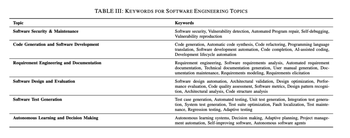論文の収集プロセスは、主にDBLPおよびarXivデータベースを検索することにより行われました。2023年後半から2024年5月までの最近の研究に焦点を当て、このアプローチにより最新の研究を含めることができました。LLMに関連しない論文や7ページ未満の論文は除外しました。さらに、選択を洗練するために、表IIIのキーワードを使用してSE関連の論文を検索しました。その後、フォーマットエラーや学生プロジェクトを含む論文を手動で除外しました。重要な研究を捕捉するために、スノーボールサーチ技法も採用しました。全体で117本の関連論文を特定しました。図2は、これらの論文を6つのSEドメインに分けた分布とLLMベースのエージェント研究の割合を示しています。ただし、一部の論文は複数のカテゴリにまたがるため、図の文献レビューは合計で117本を超えています。