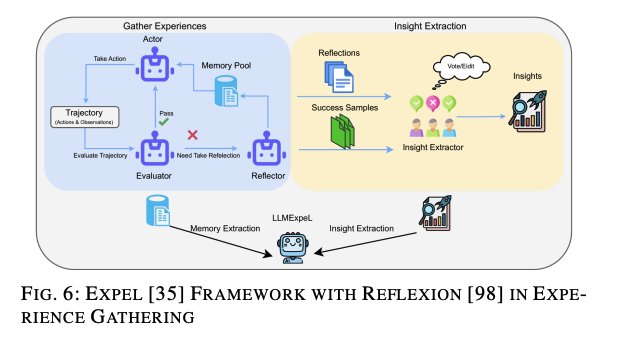 同じく2023年には、Andrew ZhaoがReActをプランニングフレームワークとして利用し、経験プールと組み合わせたExpeLフレームワークを提案しました[35]。これにより、LLMは過去の記録から洞察を抽出し、関連する後続のクエリに役立てることができます。LLMが以前の回答が間違っていた理由を分析することで、経験から学び問題を特定します。