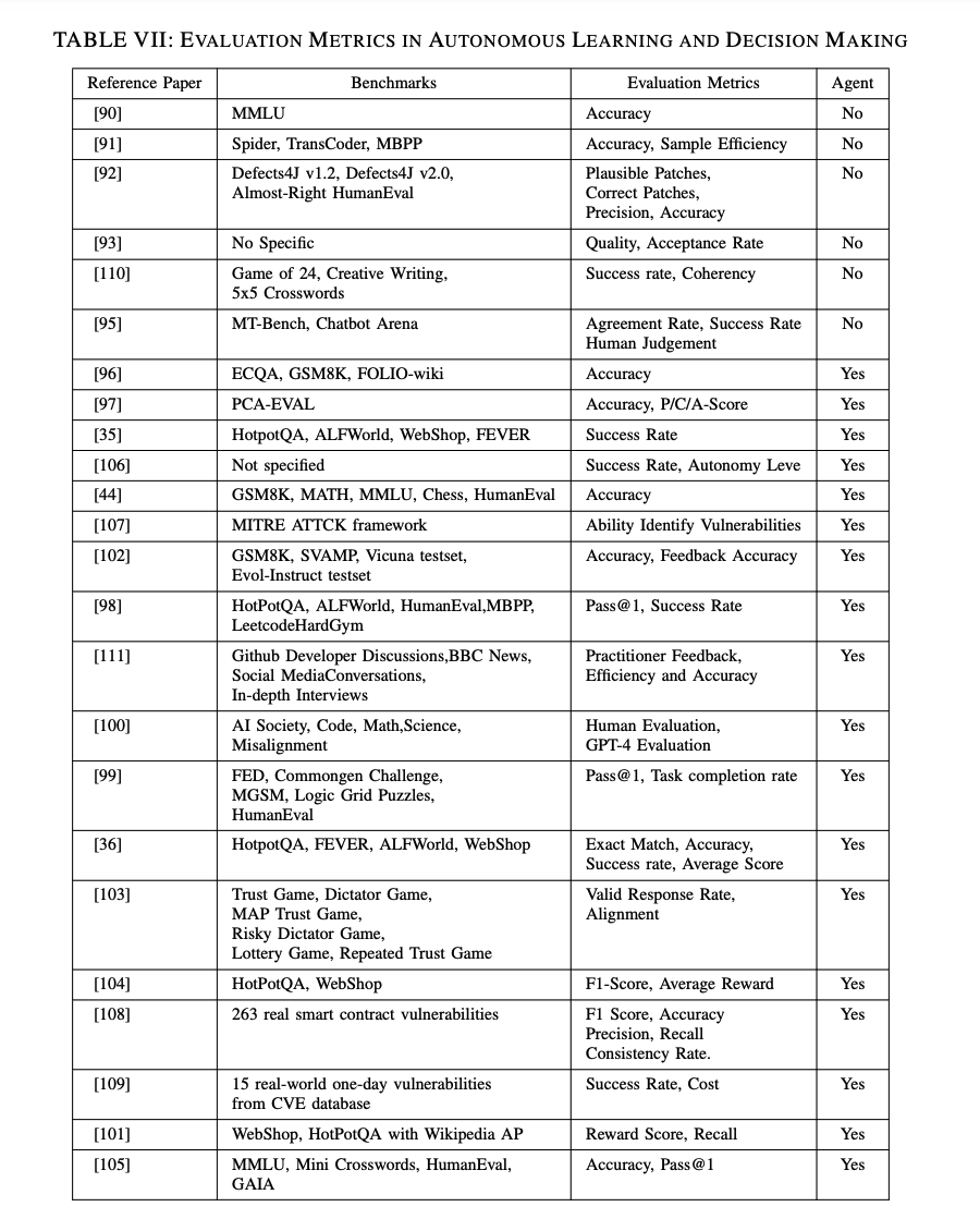 図13には、LLMsおよびLLMベースのエージェントに使用されるトップ10の評価指標が示されています。この分析から、両者によって使用される評価方法がほぼ同じであることが明らかになりました。前のセクションでも述べたように、エージェントの場合、時間と計算資源の消費を考慮する必要があります。