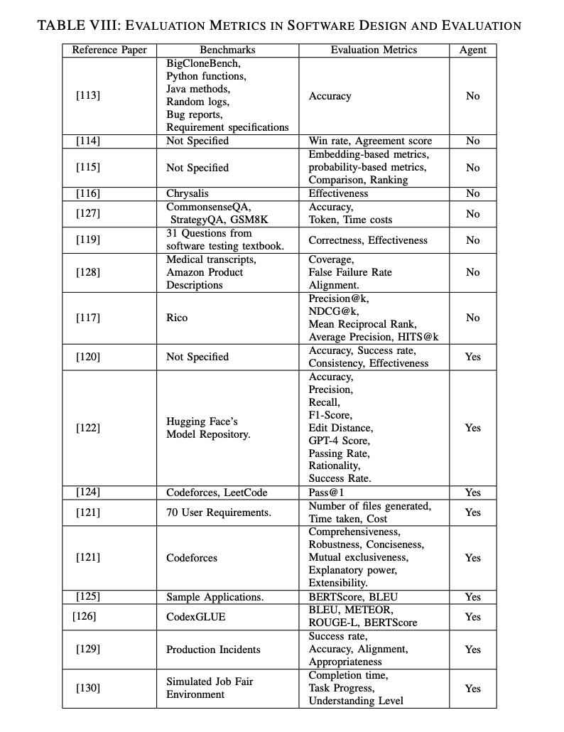 - RQ3:SEタスクにおけるLLMとLLMベースのエージェントの性能評価に最も一般的に使用されるベンチマークデータセットと評価指標は何ですか?(第IV-IX章および第X章)