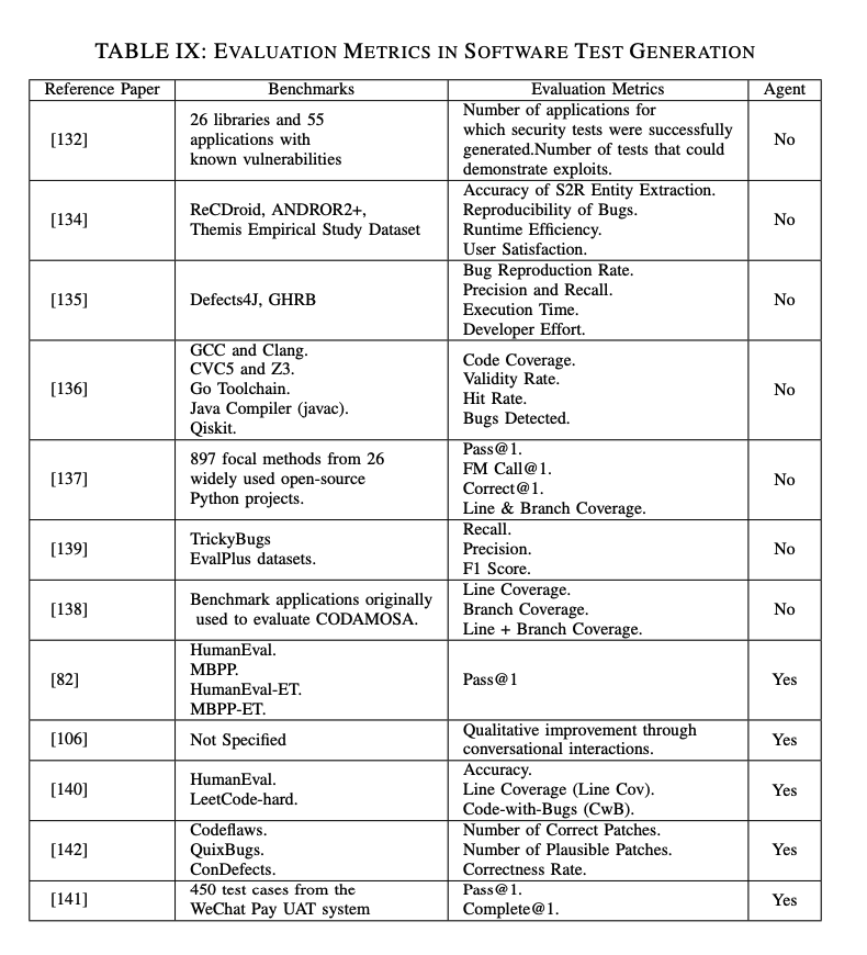これらの指標を比較することで、LLMsは個々のテスト方法の成功率を強調し、LLMベースのエージェントは全体的なタスク完了時間/コスト/効果に焦点を当てていることがわかります。LLMsは通常、バイナリ分類指標(例:ROC、AUC、F1スコア)を使用しますが、エージェントは生成および検証の両方のフェーズで成功率と精度を強調し、包括的な評価を提供します。