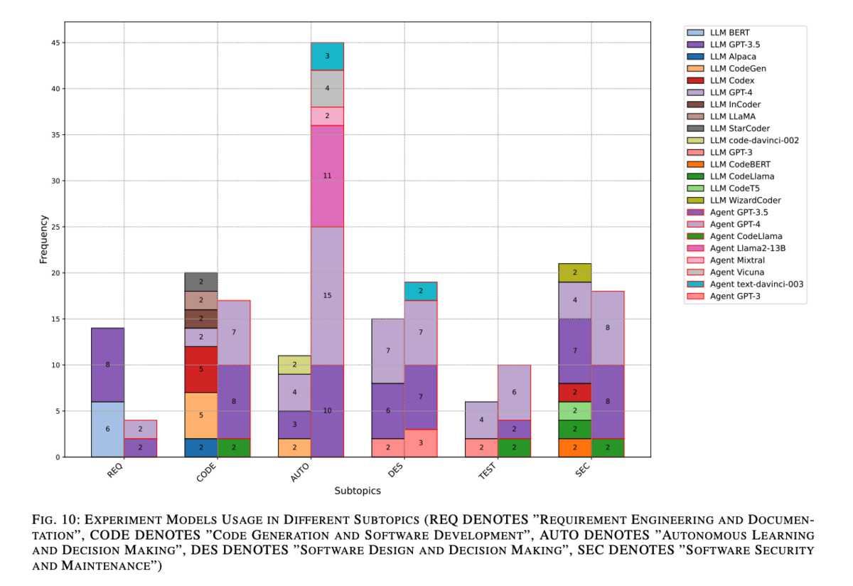 「自律学習と意思決定」サブトピックだけでなく、他のテーマでも、LLMベースのエージェントが使用するモデルの多様性(色数で表現)は比較的限られています。例えば、「要件工学とドキュメント化」サブトピックでは、実験に使用されたモデルはGPT-3.5およびGPT-4のみです。